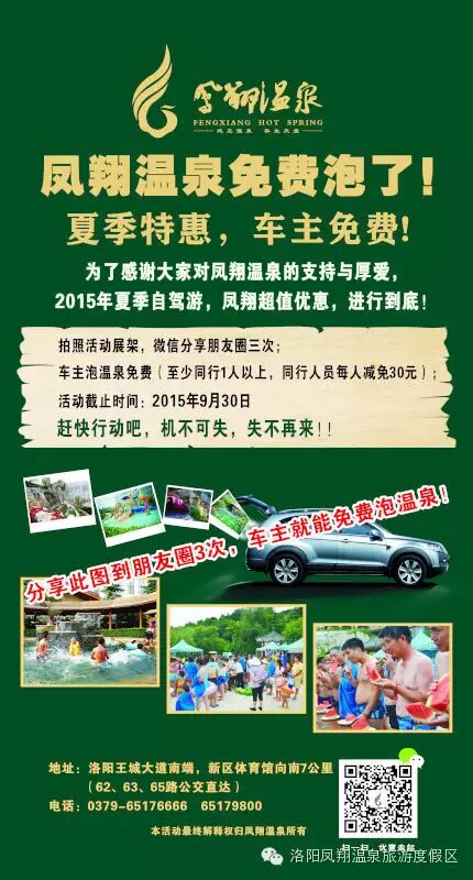 金秋时节,景色迷人,是人们户外活动、锻炼和旅游的黄金季节,早晨到公园做操、打拳、散步、跑步等适量的体育锻炼,对人体健康大有益处。秋季气候凉爽,不冷不热,工作效果最佳,但也应避免长期超负荷劳动,经常加班加点,导致机体免疫力下降引发带状疱疹、急性荨麻疹及其他旧病的复发。季节交替,则气候多变,尤其是经常有冷空气来袭,大气环流的峰面活动频繁,是许多慢性疾病的诱发因素。此时,人们暴露在外的面部皮肤有一种紧绷绷的感觉。这是由于皮肤水分蒸发加快,皮肤角质层水分缺少的缘故。如果皮肤缺水严重,则会干裂,有碍美容。 凤翔温泉免费泡继续给力 分享如下图片,分享3次,自驾车主就能免费泡温泉!每车需2人以上!同行人员每人减免30元!(平日门市价138元,节假日188元)。 活动截止2015年9月30日。 温馨提醒:本活动不与其他优惠活动同时享受。 赠票、易物票、易物卡、旅行社售票不参与此活动。